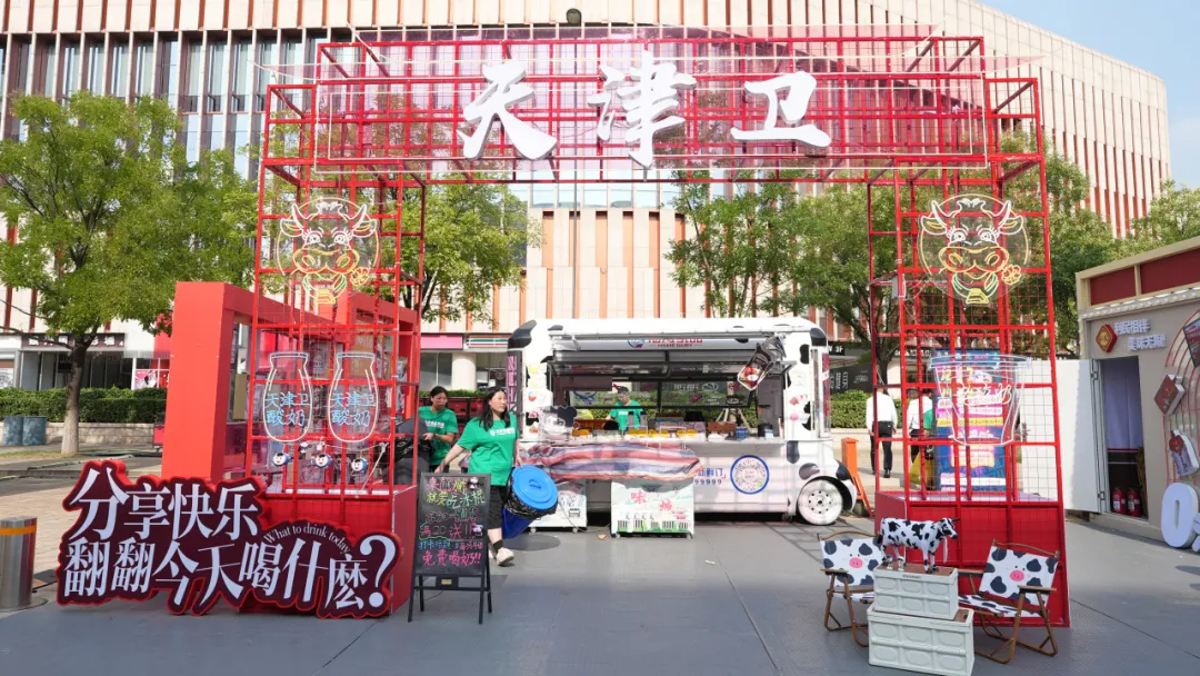 在展位設計上,結合天津地方特色,將中國紅與海河花色奶的“多姿多彩”相融合,創(chuàng)設“天津衛(wèi)”門頭吸引打卡拍照;搭建翻翻墻,市民可根據(jù)不同話題翻看不同產(chǎn)品,充滿趣味互動性。售賣牛奶的牛奶巴士動感十足,將牛奶花紋與“哪吒IP”形象相融合,可愛又富有活力。