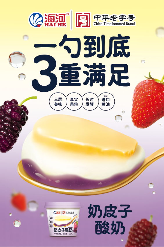 輕輕揭開杯蓋,來一場舌尖上的立體穿越。啟程于凝脂般金黃濃醇的奶皮子,特選進口黃油在單杯慢發酵時光中凝萃的精華,每一口都是濃郁的脂香序曲。勺子如探險家般向下穿梭,觸達雪白柔滑的酸奶腹地,自然發酵的清新酸香溫柔承接。而旅程的高潮,在杯底熱烈綻放,大顆草莓與桑葚果粒浸潤在絳紫色果醬中,如同埋藏的味覺寶藏。一勺到底,不是簡單的分層品嘗,而是一次從濃郁奶脂、清新乳香到鮮活果粒爆漿的完整味覺敘事,金黃、雪白、絳紫在口中奏響出層次分明的交響曲。這杯酸奶,讓“吃”變成一場奇妙的感官旅程,直接開辟了“果粒奶皮子酸奶”這一全新細分賽道,海河乳品公司也成為該領域無可爭議的定義者與領跑者。