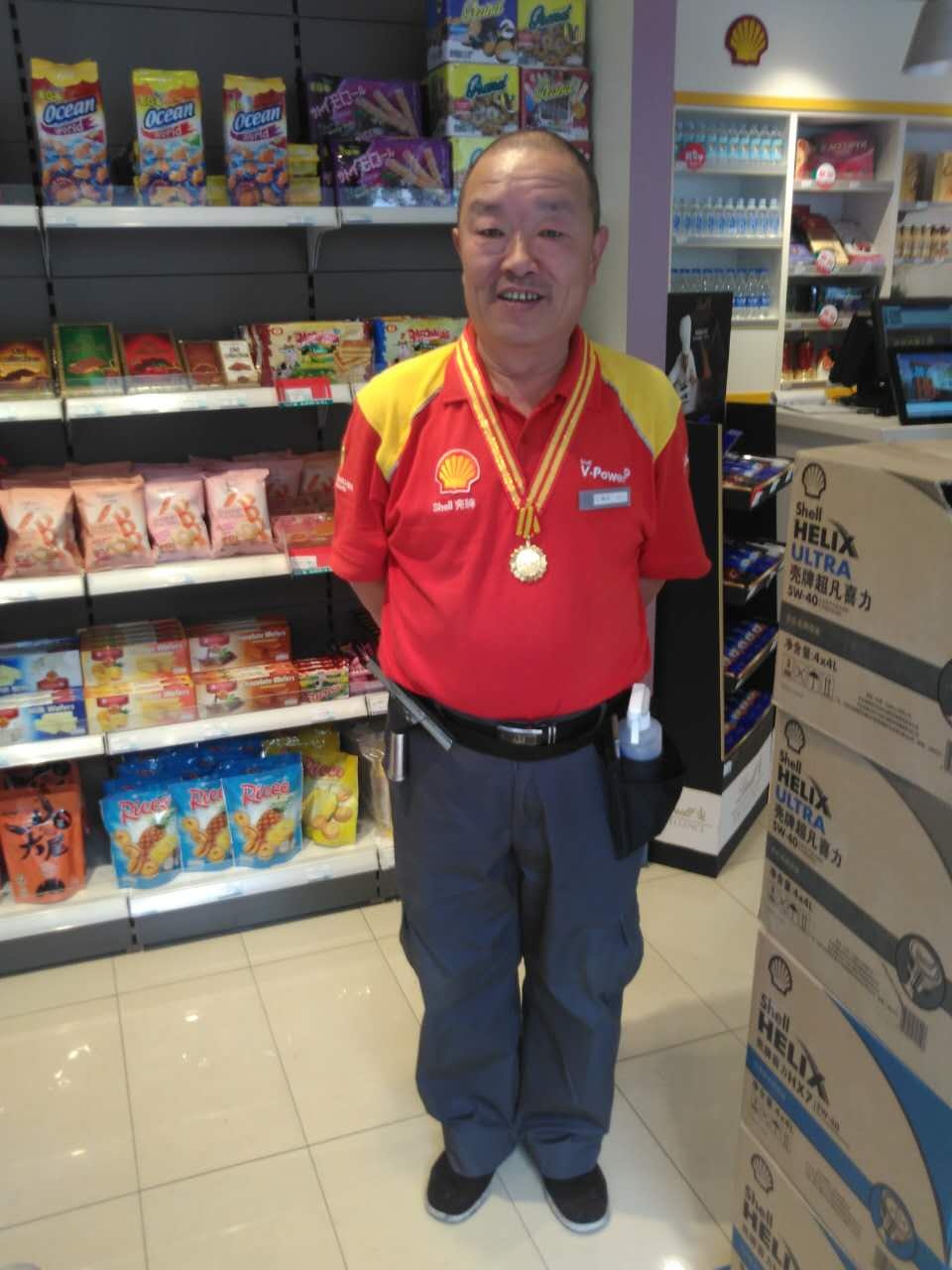 2001年-2002年,在殼牌開展為期六個季度服務(wù)標(biāo)兵評選活動中,每一階段,王師傅均被評為服務(wù)標(biāo)兵。曾有一次, 殼牌中國的同事來到白堤路油站參觀,交流之余問起王師傅:“您身邊的同事要是情緒不好是不是會影響到您。”老師傅很自信的說:“不可能,只有我能影響別人,別人不會影響到我。”王師傅就是這么自信,他始終會把他良好的工作狀態(tài)一直傳遞給身邊的每一位同事,正是由于年復(fù)一年、日復(fù)一日的努力工作使其獲得了“2015殼牌全球微笑之星”的榮譽稱號,并作為中國員工代表到日本參加全球盛典,接受殼牌授予的最高榮譽。